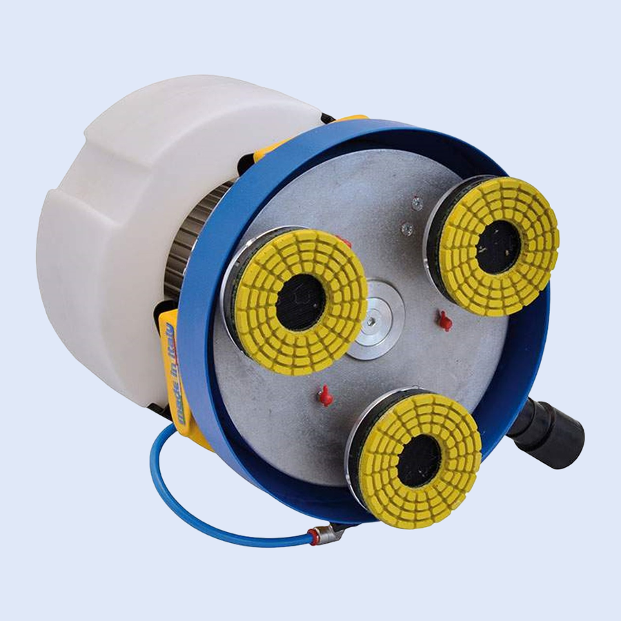 UFO is a manual planetary polisher for grinding and polishing counter tops, stairs, edges and narrow areas. Thanks to its powerful motor and to the counter-rotating planetary it is possible to grind and to polish marble, granite and concrete. It differs from all the others machines on the market for its robustness and its perfect balance. The speed of the abrasives is studied in order to make the machine stable, easing the grinding and polishing operations. It is supplied with splash guard and connection for vacuum cleaner. Thanks to its accessories, you can transform the Ufo in to a Floor machine for: